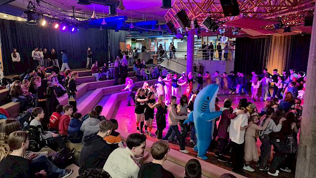 Unsere SMV hat am Freitag vor den Faschingsferien in der Bewegungspause (passend!) zum Tanzen und Singen eingeladen. Nachdem Herr Koscis mit seiner Unter-/Mittelstufenband das bunte Treiben mit einem Pausenkonzert eröffnet hatte, wurde per Polonaise die Kulturmulde in einen Faschingsballsaal verwandelt. Hierfür wurde mit Licht und Ton für ein tolles Ambiente gesorgt. Schöne Ferien!
