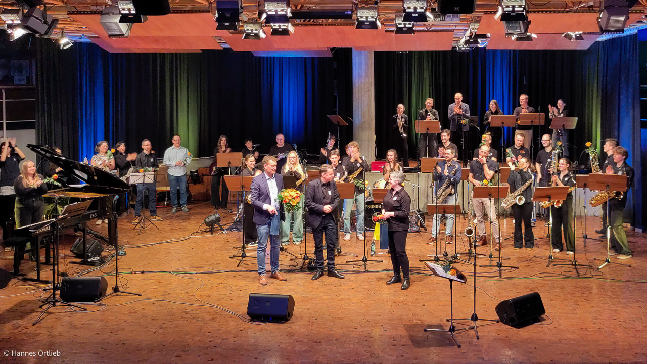 Der Höhepunkt des Abends ließ nicht lange auf sich warten: Das große Finale mit über 30 ehemaligen und aktuellen Jazzbandmitgliedern versammelten sich zur großen "Allstar-Band" auf der Bühne – ein beeindruckendes Klangkollektiv, das die Kulturmulde zum Beben brachte. Unter ihnen befanden sich auch professionelle Musiker wie Posaunist Jan Jäger und Trompeter Toni Bechtold oder der Schlagzeuger Bernd Elsenhans, die ihre Wurzeln ebenfalls in der WeG-Jazzband haben.