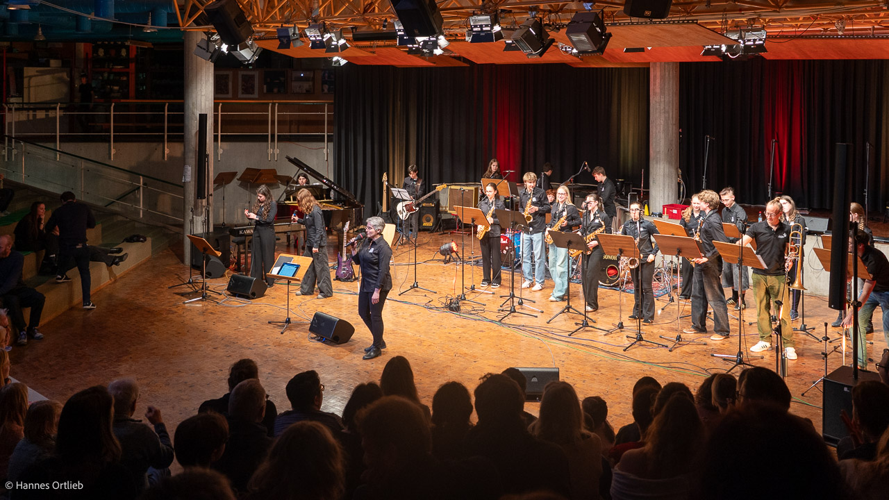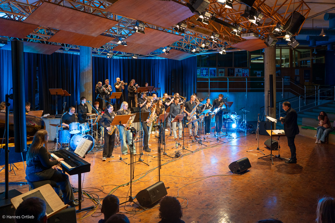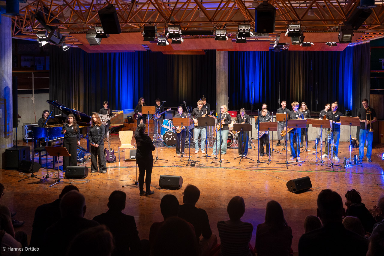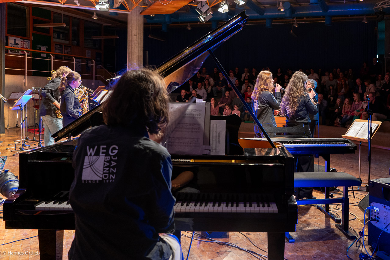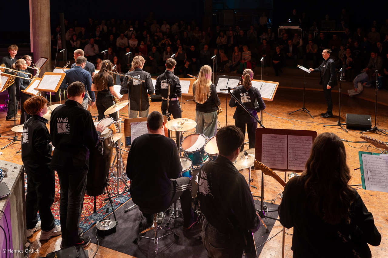 Im Anschluss betrat die aktuelle WeG-Jazzband des Werkgymnasiums mit 19 Musikerinnen und Musikern die Bühne. Geleitet wird das Ensemble seit einem Jahr von Julia Strasser, die die musikalische Verantwortung nach über 34 Jahren Bandgeschichte von Gründer Joachim Kocsis übernommen hat. Mit fünf Stücken präsentierte sich die Band stilistisch vielseitig und musikalisch souverän. Für einen emotionalen Moment sorgte dabei der James-Bond-Titel „Skyfall“, eindrucksvoll interpretiert von den Sängerinnen Jana Schrepler und Lotta Zimmermann.