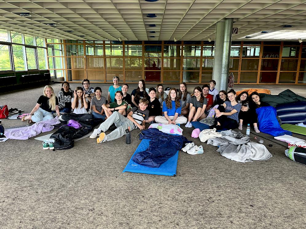 Nachdem der Schulchor den Abschluss des Kälteprojekts musikalisch umrahmte, dachten sich die Chormitglieder mit den Musiklehrerinnen Lisa Sörös und Julia Strasser, dass man die einmalige Gelegenheit einer leergeräumten Bibliothek doch auch für eine Übernachtung in dem ansonsten mit Bücherregalen und Möbeln gefüllten Raum nutzen könnte.