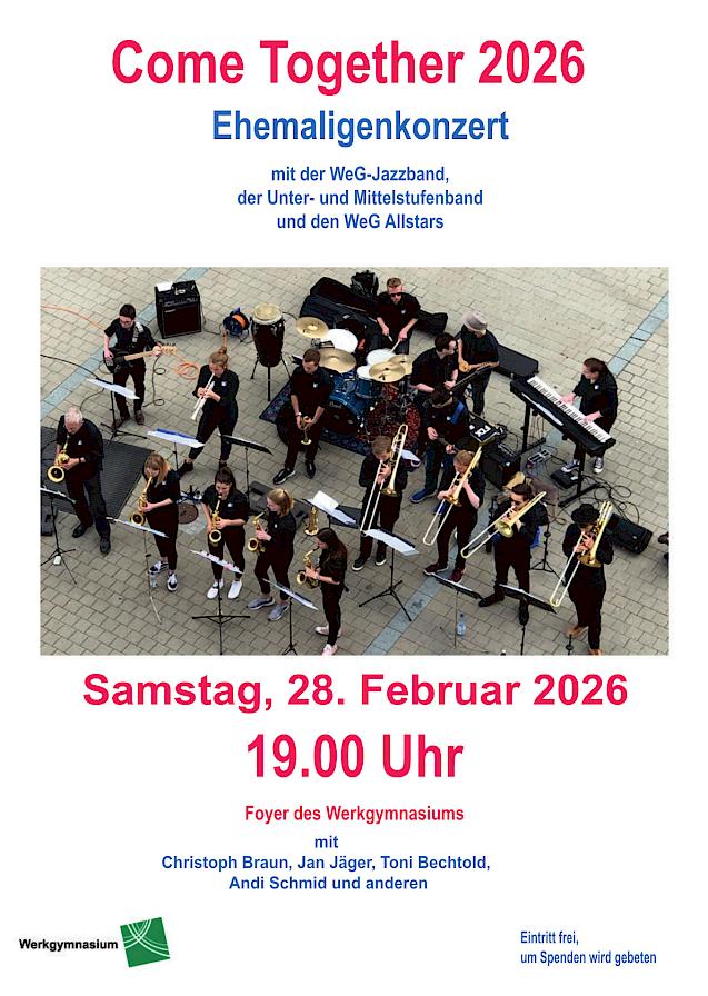 Am Samstag, 28. Februar 2026, um 19.00 Uhr wird die Kulturmulde des Werkgymnasiums wieder zum Treffpunkt für Jazzliebhaberinnen und -liebhaber: Mit der dritten Auflage des „Come together“-Konzerts knüpft die WeG-Jazzband an die Erfolge der Veranstaltung in den Jahren 2012 und 2021 an und verspricht einen Abend voller Groove, Energie und Musikbegeisterung.