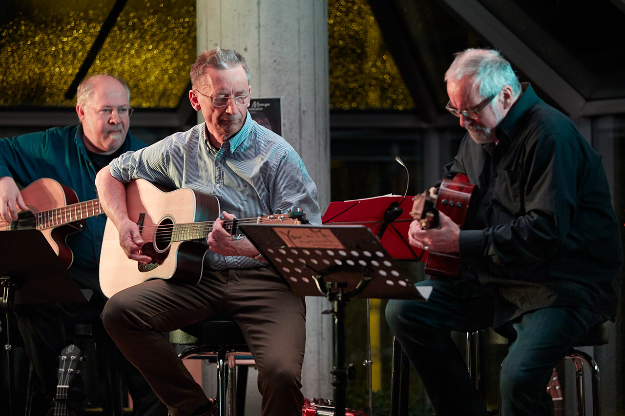 Schließlich war es Zeit für den deutschen Teil. Dass auch Lieder, die zwanzig Jahre alt sind, hochaktuell sein können, zeigte Reinhard Meys „Narrenschiff“, das Michael Loessin mit der Hilfe von Gerd Schock, Johannes Fiedler und Petra Schwab präsentierte. Anna Hank aus der Jahrgangstufe 7 war schon zum wiederholten Male dabei; sie sang „Je ne parle pas français“ von Namika und eine Eigenkomposition: „Du bist ein Geschenk“, begleitet von Mia Hitzler sowie Ricarda Rickert und ihrer Mutter an der Gitarre. Reinhard Mey hat auf seinem letzten Album den ironisch–witzigen Titel „Herr Fellmann, Bonsai und ich“ veröffentlicht, von dem Gerd Schock und Johannes Fiedler eine höchst amüsante Version vortrugen. Zum Schluss versammelten sich alle Akteure auf der Bühne, um Zupfgeigenhansels Lied „Miteinander“ zu intonieren, bei dem fleißig mitgesungen wurde. Die lautstark geforderte Zugabe, Reinhard Meys „Gute Nacht Freunde“ schloss einen für alle Beteiligten - Zuhörer wie Akteure - harmonischen und vergnüglichen musikalischen Abend ab, dem sicher weitere folgen werden.