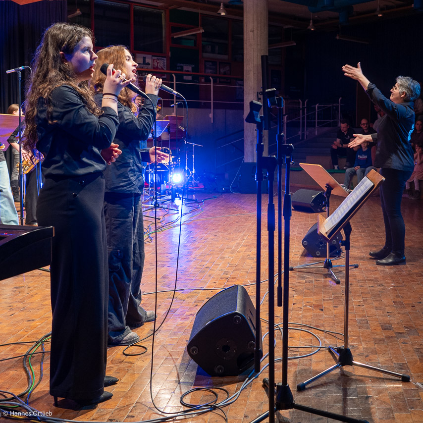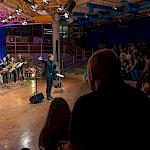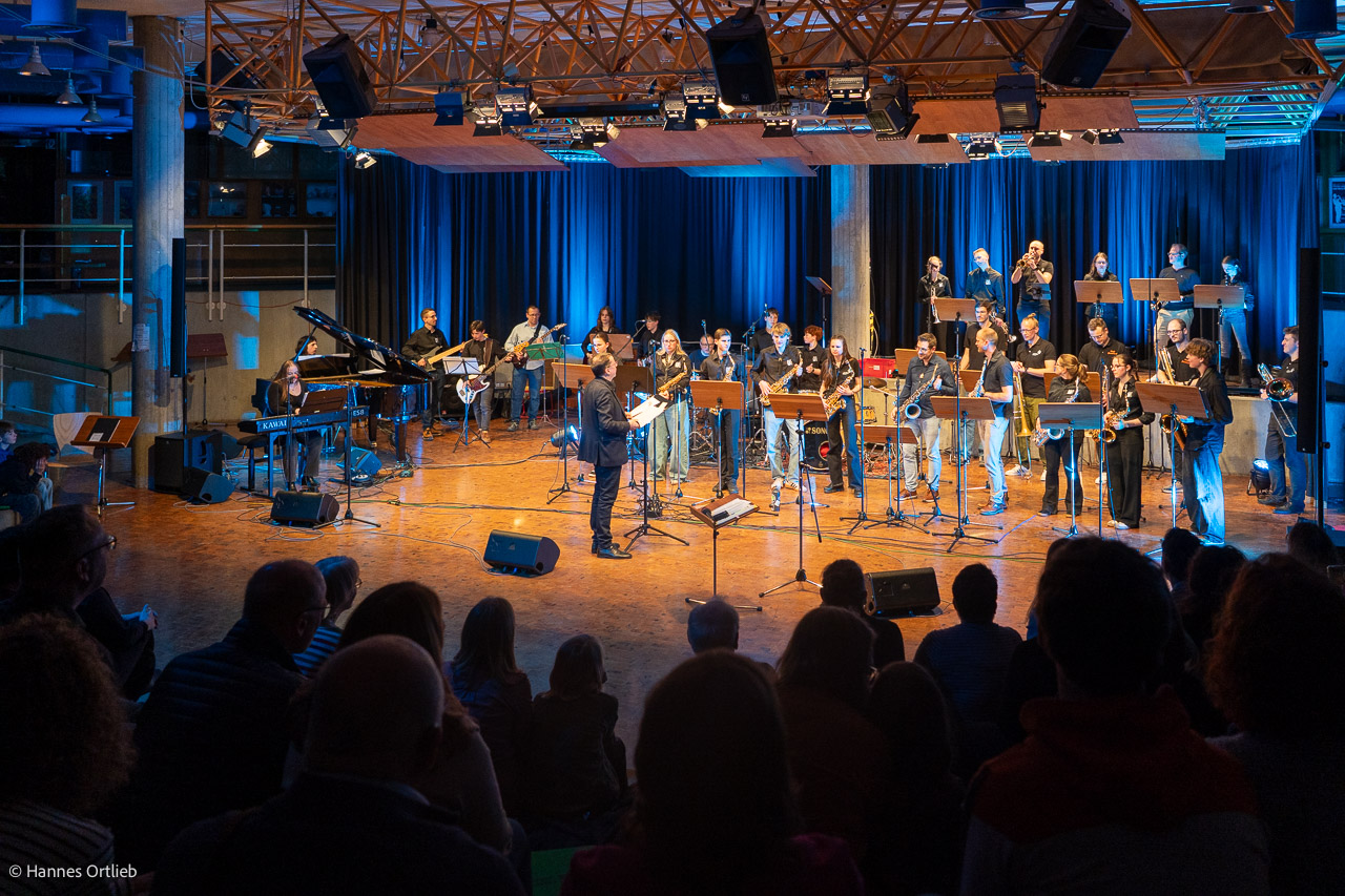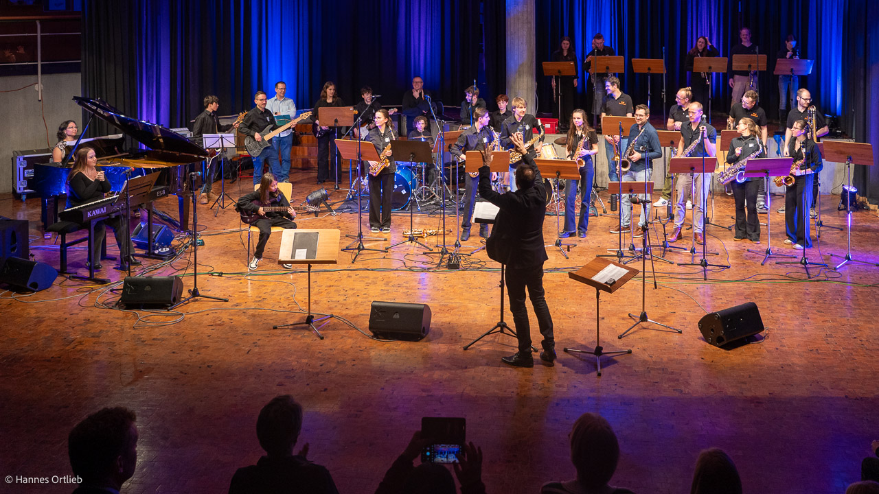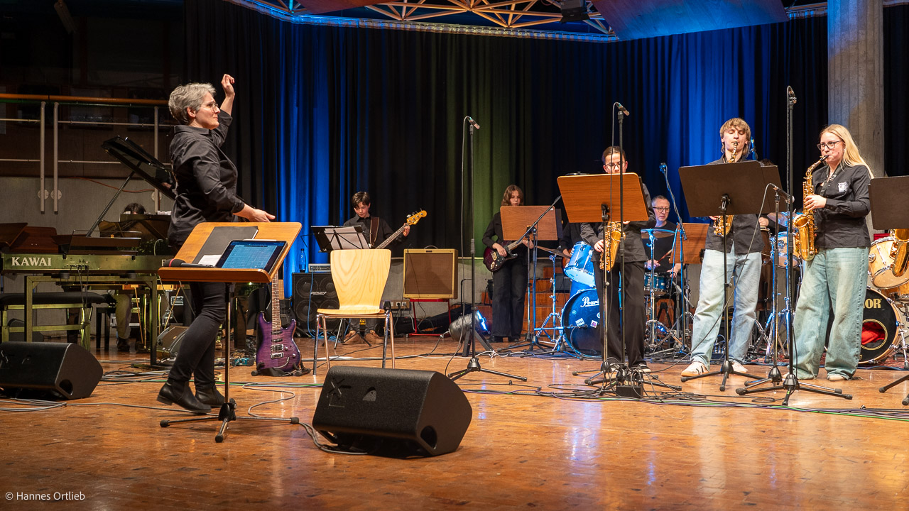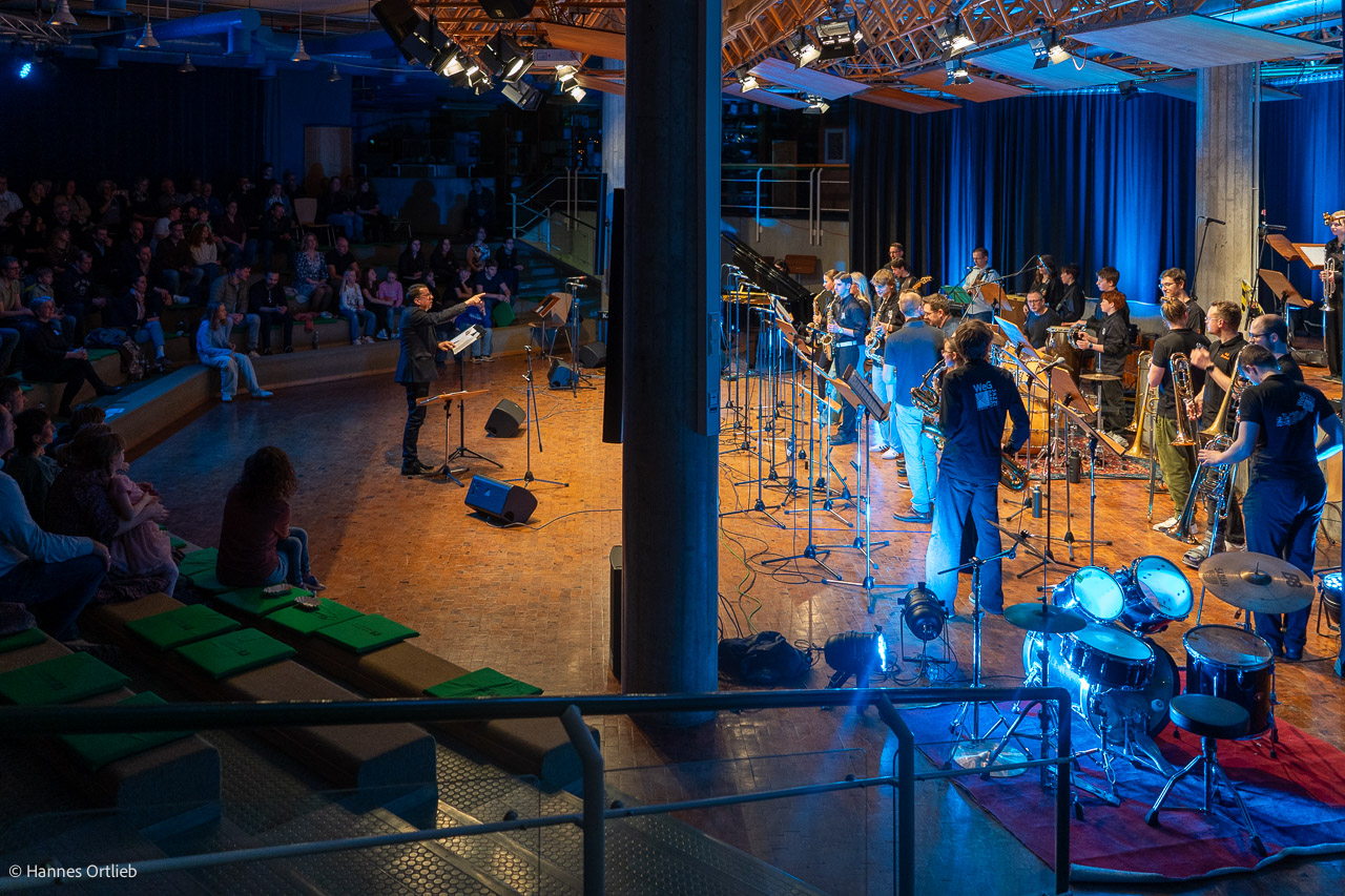 Im Anschluss betrat die aktuelle WeG-Jazzband des Werkgymnasiums mit 19 Musikerinnen und Musikern die Bühne. Geleitet wird das Ensemble seit einem Jahr von Julia Strasser, die die musikalische Verantwortung nach über 34 Jahren Bandgeschichte von Gründer Joachim Kocsis übernommen hat. Mit fünf Stücken präsentierte sich die Band stilistisch vielseitig und musikalisch souverän. Für einen emotionalen Moment sorgte dabei der James-Bond-Titel „Skyfall“, eindrucksvoll interpretiert von den Sängerinnen Jana Schrepler und Lotta Zimmermann.