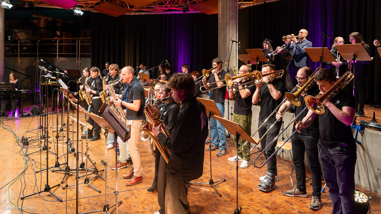 Bereits zum dritten Mal kamen aktuelle und ehemalige Mitglieder der Jazzband zusammen, um gemeinsam zu musizieren und in Erinnerungen an über 35 Jahre Jazzbandgeschichte zu schwelgen. Viele der Absolventinnen und Absolventen waren schon am Vorabend angereist, um sich bei einem gemütlichen Wiedersehen auszutauschen. Der Konzerttag begann mit einer Schulführung für ehemalige Schülerinnen und Schüler durch Schulleiter Ralf Kiesel, bevor sich der Fokus ganz auf die Musik richtete: Proben in unterschiedlichen Besetzungen, spontane Sessions und intensive Vorbereitungen für den großen Abend.